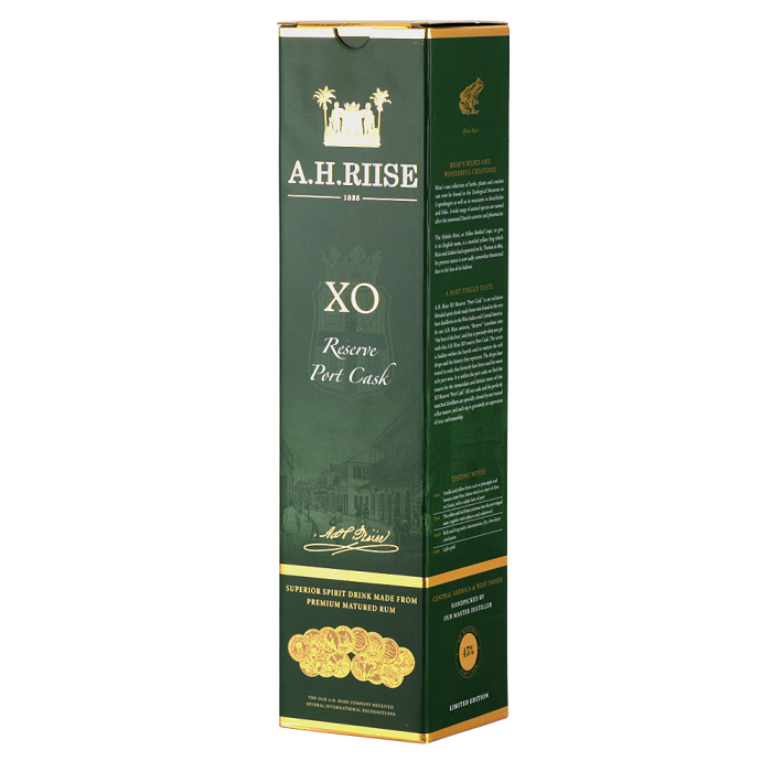 Tam, kde sa Karibik stretáva s Južnou Amerikou. A. H. Riise Port Cask obsahuje viac než 15 rôznych znamenitých rumových destilátov, ktoré majú priemerne 20 rokov a všetky špeciálne vyberá pivničný majster. Výsledný rum nakoniec dozrel v sudoch - na šesť mesiacov sa uložil do suda Port Vins (rúrka) od známeho výrobcu portského Cálem.